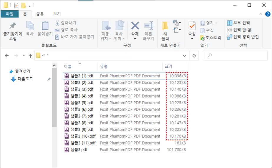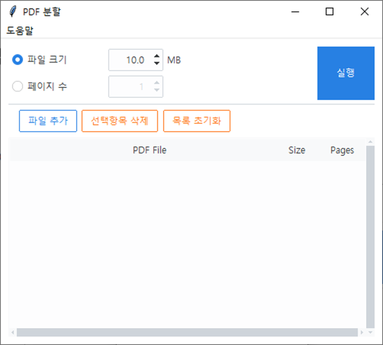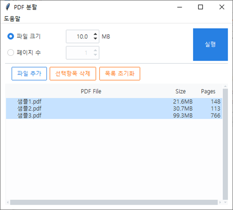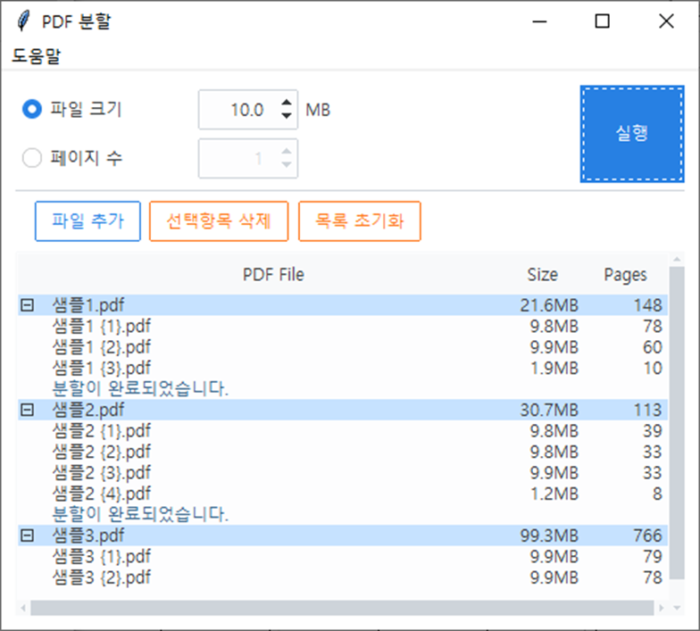 파일 크기나 페이지 수를 지정한 후 실행을 누르면 원본 파일이 차례대로 분할됩니다. 분할된 파일은 원본 파일 이름에 순서대로 {1}, {2}, {3}, …을 붙여 생성되어 원본 파일 위치에 저장됩니다.