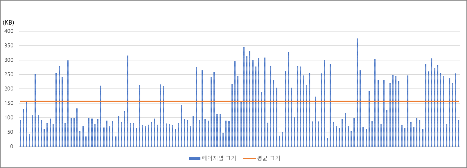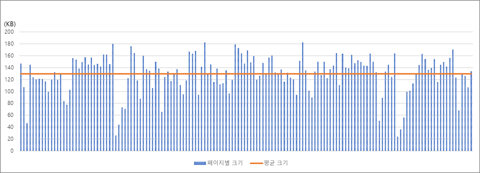 PDF 파일은 페이지마다 용량의 편차가 꽤 큽니다. 책 1권을 동일한 조건으로 스캔해도 페이지마다 크기가 균일하지 않고[A], 전자소송 기록처럼 텍스트와 스캔이 섞여 있는 파일은 꽤 큰 차이를 보입니다[B].